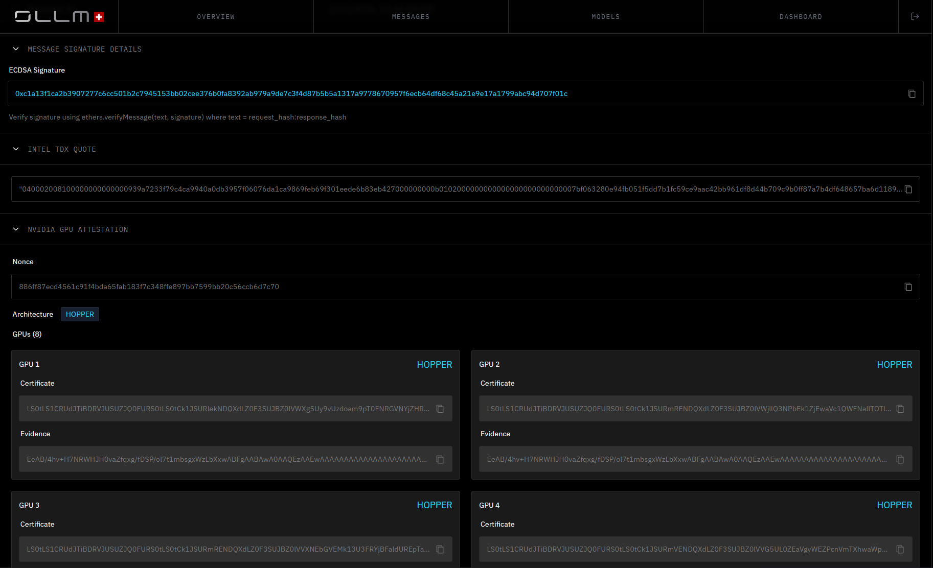 For a detailed breakdown of the attestation receipt structure, including Intel TDX quote fields, NVIDIA GPU evidence, message signatures, and external trust anchors, see the Attestation Data Reference.